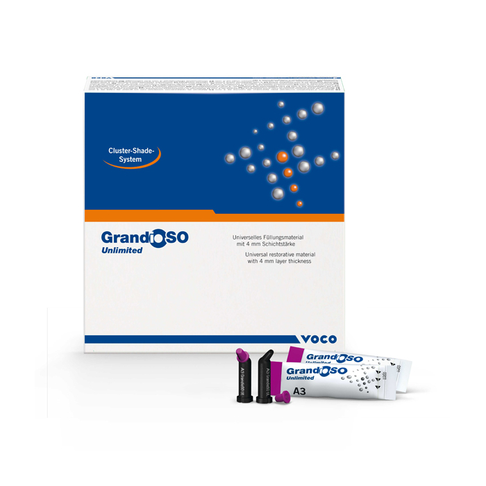GrandioSO Unlimited - compozit universal nano-hibrid, fotopolimerizabil, radio-opac, care poate fi aplicat in straturi cu o grosime de pana la 4mm.